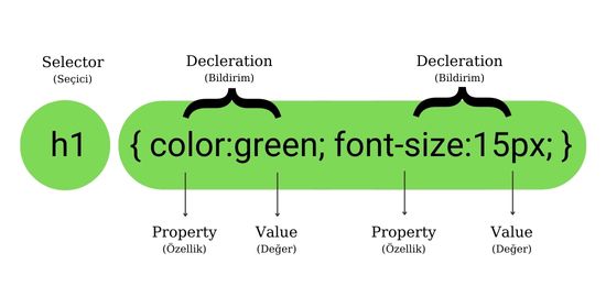 Her CSS kuralı bir “seçici” ve bir ya da daha fazla “bildirim” (declaration) içerir. Bildirimler sayesinde seçilen HTML elemanlarının nasıl görünmesi gerektiği belirlenir. Her bildirim, “özellik” (property) ve “değer” (value) olmak üzere iki bölümden oluşur. “Özellik“, stilin hangi yönünü değiştireceğimizi (örneğin, renk, yazı tipi, boyut) tanımlar; “değer” ise bu özelliğe atanacak spesifik bilgiyi (örneğin, kırmızı renk, 16px yazı boyutu) içerir.