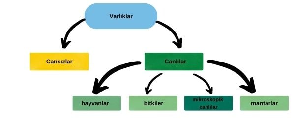 Yukarıdaki resimde Varlıklar sınıfı bizim üst sınıfımız olarak oluşturulmuştur. Cansızlar ve Canlılar sınıfları ise Varlıklar sınıfından türetilen 2 alt sınıftır. Ayrıca Canlılar sınıfından Hayvanlar, Bitkiler, Mikroskopik Canlılar ve Mantarlar olmak üzere 4 tane daha alt sınıf oluşturulmuştur. Bu vesileyle de belirtmek gerekir ki oluşturulan her alt sınıfın alt sınıfı dolaylı yoldan en üst sınıfın da alt sınıfı olmaktadır.