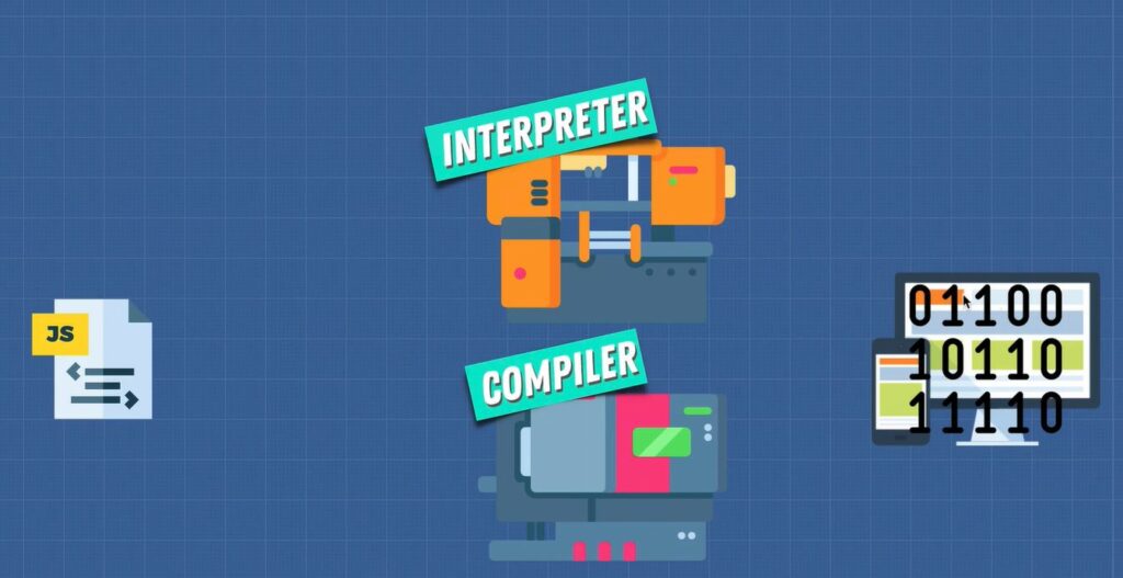JavaScript ilk çıktıkğında interpreter olarak tasarlanmıştır. Ancak yaşanılan hız sorunlarını aşmak adına bazı JavaScript motorları JIT (Just-In-Time) ile compiler özelliklerine de sahip hale gelmiştir. Böylece interpreter, kodu hemen çalıştırmamıza olanak sağlarken compiler ise çalışırken ilgili kodun optimize edilmesine izin verir.